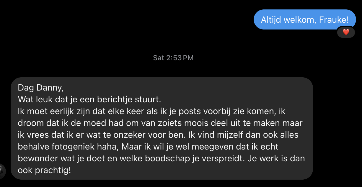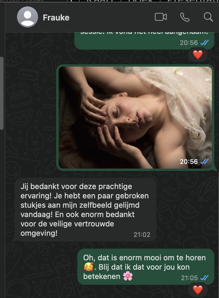 Frauke’s sessie heeft me opnieuw laten zien waarom ik hier zo gepassioneerd over ben. Het raakte me diep toen ik na de sessie dit berichtje van haar kreeg: